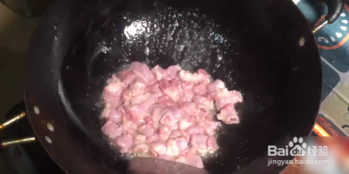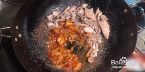 炒至猪肝变色后,加入料酒炒至一会后转小火,依次加入姜蒜、豆瓣酱炒香,炒出红油。
