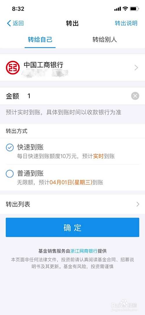 3.接着,输入转出金额,选择金额到账的银行卡。