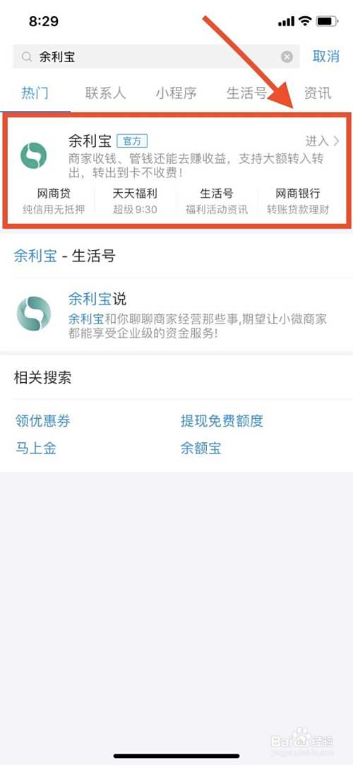 1,首先,打开支付宝,在搜索栏搜索“余利宝”并点击进入。