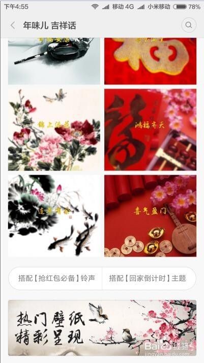在打开的年味儿页面中,翻动屏幕找到自己喜欢的壁纸,我们在这里选择喜气盈门壁纸