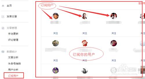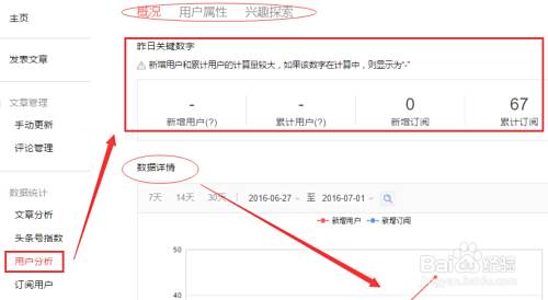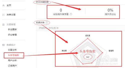 数据统计:文章分析,可以看到文章详细的数据。头条号指数,可以看到现在账号目前的头条号指数是多少。用户分析,可以看到你的用户数量,用户属性,兴趣分布。订阅用户,可以看到有哪些用户订阅了你的头条号。