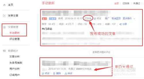 恭喜,文章发布成功之后,在文章管理:手动更新,可以看到发布成功的文章,也可以看到审核未通过的文章。(审核未通过,根据提示的要求去修改就可以了)