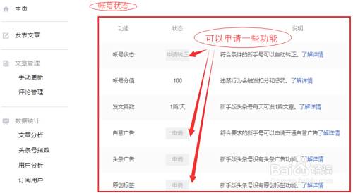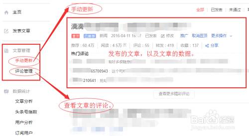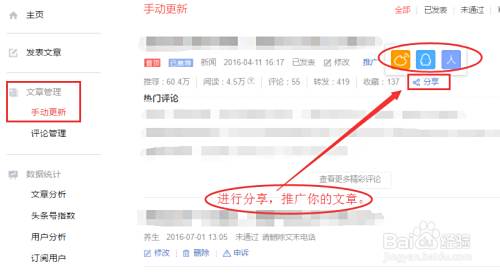 文章管理:手动更新,你可以在这里看到你发布的文章,以及文章的相关数据,推荐量,阅读量,评论数,转发数,收藏数,还可以进行分享。评论管理,你可以看到文章的评论,进行回复,以及推荐评论。