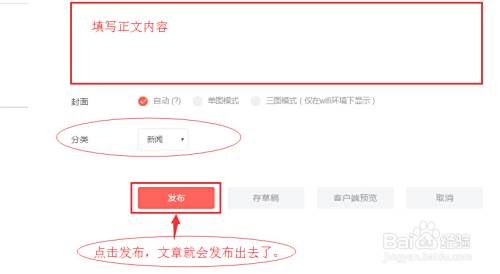 填写好文章内容后,你可以选择文章分类,然后点击发布,那你的文章就发布出去了。(发布后需要通过审核,不选择发布文章的话,可以存进草稿,也可以先在客户端进行预览。)