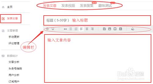 在今日头条后台,点击发表文章,你可以选择:发表文章,发表视频,发表图集,趣味测试,这里我们选择:发表文章,填写你的文章标题,文章正文内容,你可以在编辑栏上编辑你的内容。