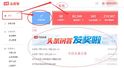 主页:你可以直接发表文章,你可以看到你有多少个订阅用户,推荐用户,头条号指数,还能看到你所有文章的累计阅读量,以及今日头条的一些公告。