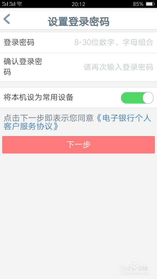 在首次登录工商银行手机银行时,需要设置首次登陆的密码,而登录密码必须是8到30位的数字和字母的组合。在经过第一次的登录密码的确认验证之后,可以选择点击电子银行个人客户服务协议来阅读。