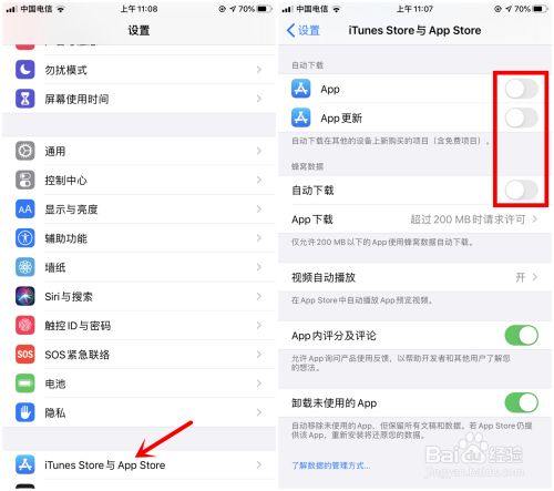 返回到设置面板,选择 iTunes Store与App Store ,把 App、App更新、自动下载 都关闭