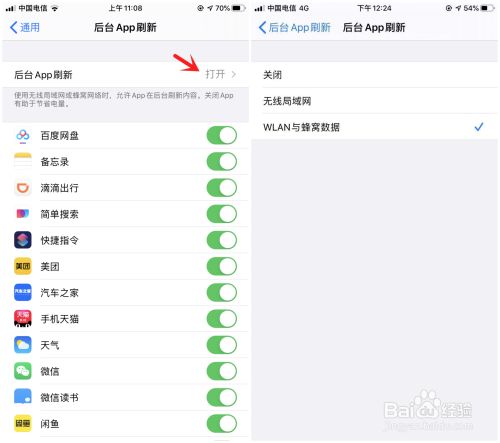 如果想全部关闭,可以点击此界面的 后台App刷新 ,再在打开的面板选择 关闭 即可,新打开的界面还有其他两个选项即 无线局域网 和 WLAN与蜂窝数据 ,表示这些App使用什么流量进行后台刷新(联网获取数据),是只使用WIFI还是WIFI和手机流量都使用。