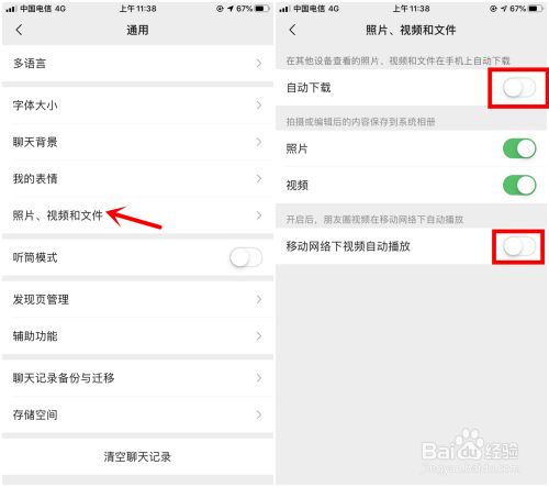 在通用面板中选择 照片、视频和文件,把 自动下载 和 移动网络下视频自动播放 关闭