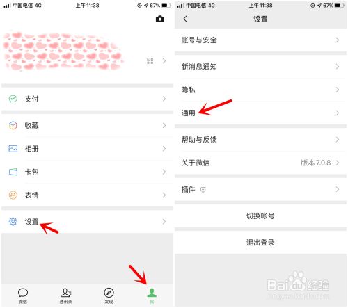 打开微信App,点击 我 面板中的 设置 进入设置面板,然后选择 通用