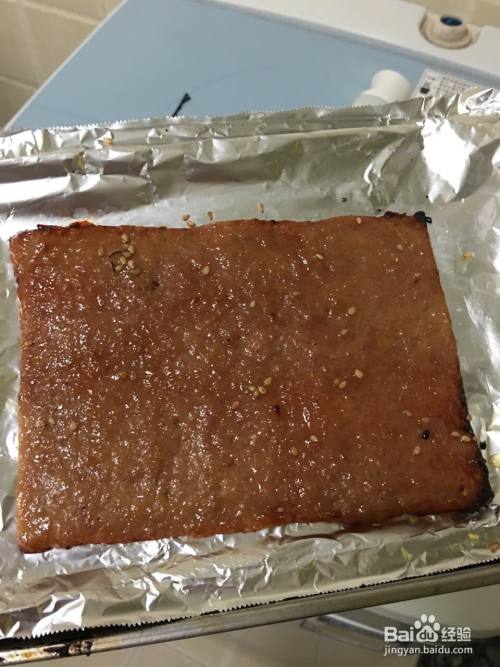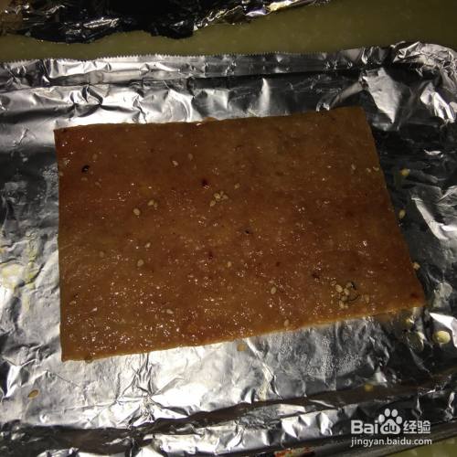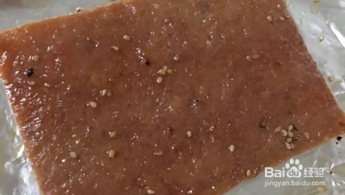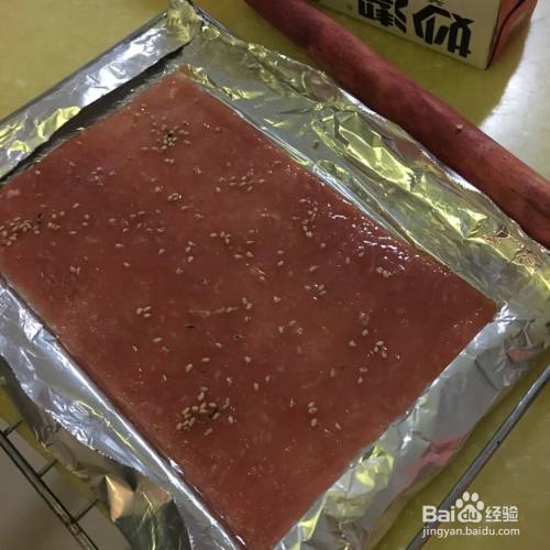 把肉放在铝箔上,上边铺一层保鲜膜,用擀面杖擀平,想要规则的形状就将铝箔边折叠起来,用擀面杖擀平。刷上一层蜂蜜,撒上一层芝麻。