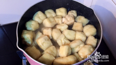 油豆腐在沸水中煮3-5分钟,待其自然冷却。