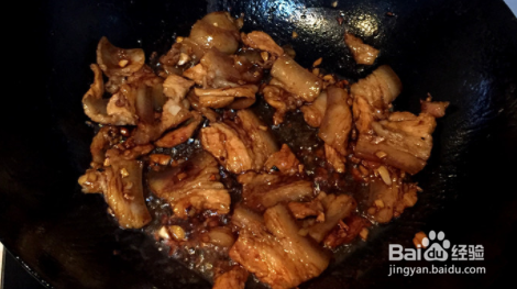 热锅少油,放入五花肉片、姜、蒜、白酒爆炒,炒到五花肉的油被逼出来为止。