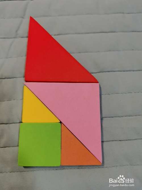取出一个红色大号三角形板放在粉色大号板的上面,如图所示。