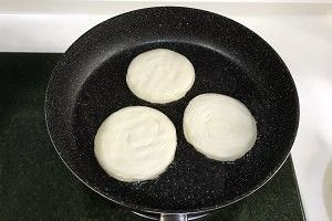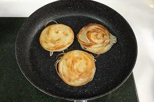 平底锅中倒入食用油,油要多点,太少了容易煎糊,不易熟。建议用中小火慢慢煎制,煎至一面上色后翻面继续。