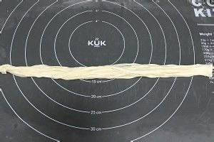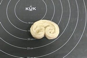 从第一个松弛的面条开始,用手分别从两端往外轻拉,然后两头往中间卷起来,之所以前面步骤面条要松弛,就是为了此刻用手稍稍拉长不易断开。
