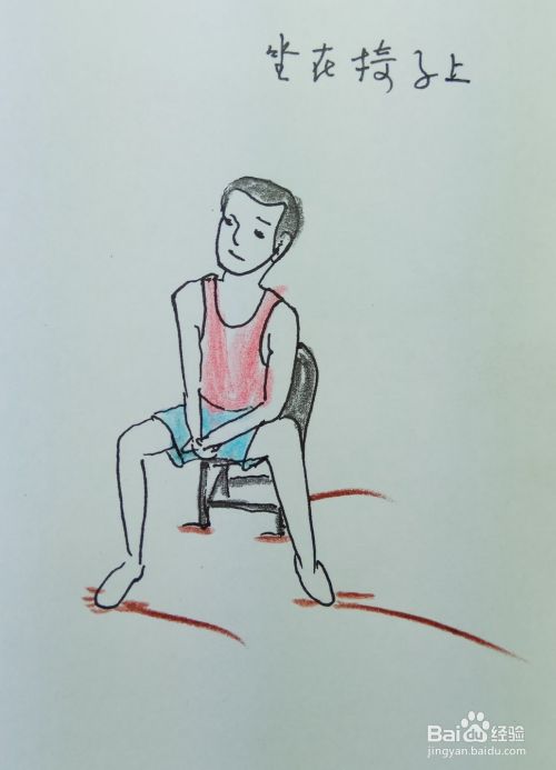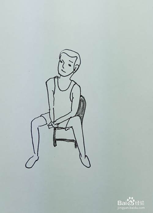 再用线条和曲线画出他的身体和两条腿部,他正在那儿坐着呢。