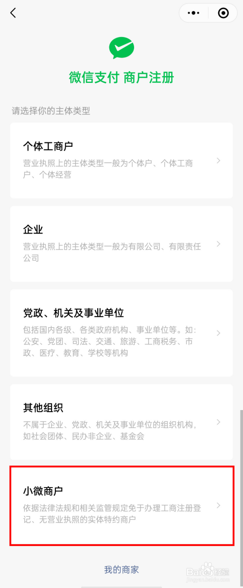 如之前有过账号,需在微信认证注册新账号,并选择小微商户