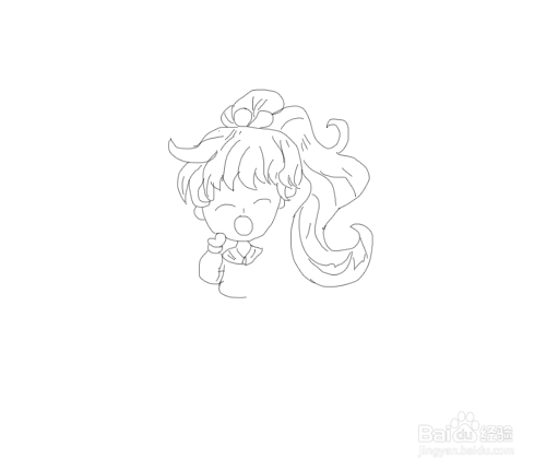 画好头部之后,我们再画出女孩的脖子,然后再画出身体及左侧的胳膊及手部,如图所示: