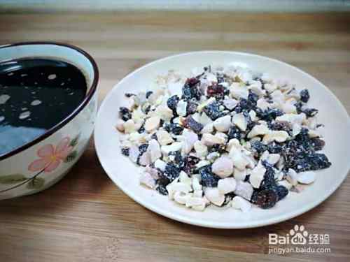 把坚果取几小袋,倒入盘中,用刀切碎点,红糖用温水化开。