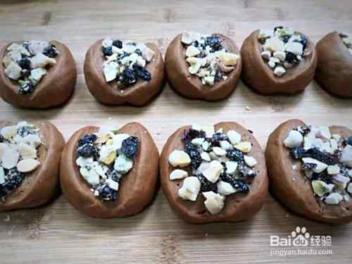 接着放板上2次发酵10分钟,把坚果碎灌到剂子切口中。