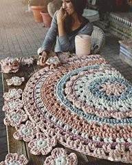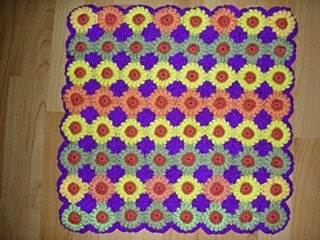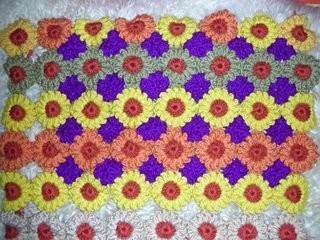 最后将勾好的所有小片在正面联起来,双面都联好后,把四边合并,勾上花边,一个地垫就完成了。