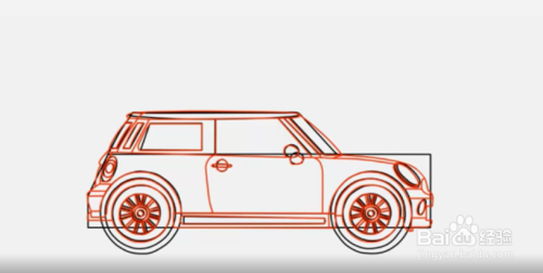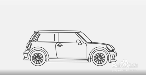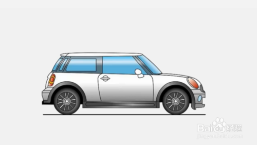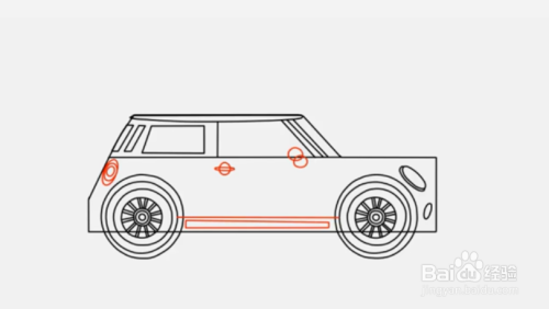 在车身下部画一个扁长的长方形,在车身上再画几个椭圆作为镜子和车灯。