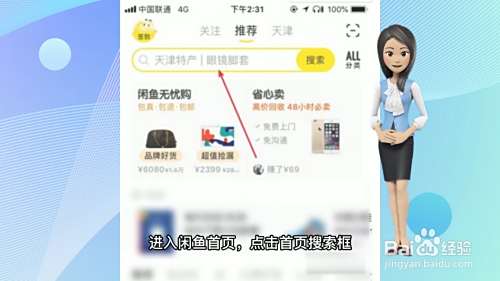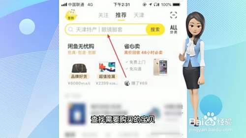 进入闲鱼首页,点击首页搜索框,查找需要购买的宝贝。