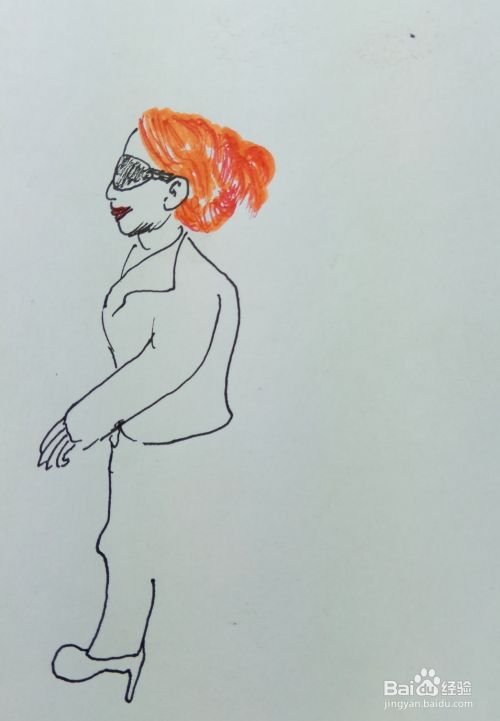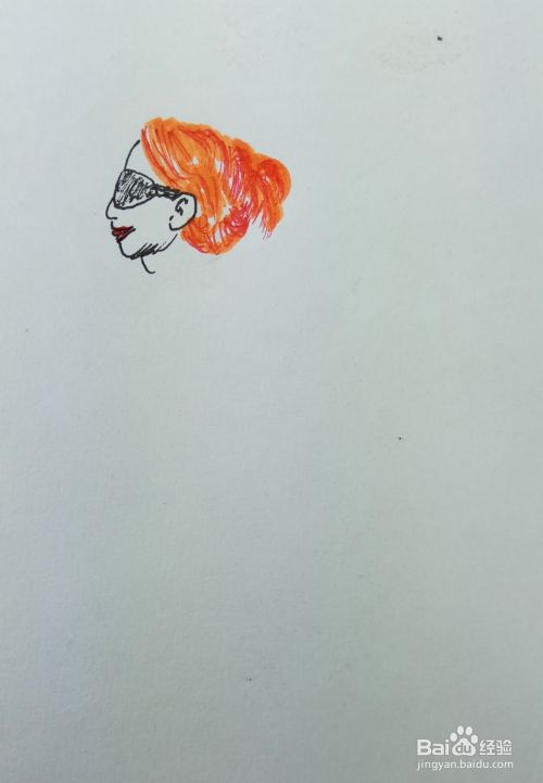 在白纸上用线条和曲线画出一个女人的头部轮廓,并画出她的五官和头发,然后再用水彩笔涂出她的头发色彩,眼镜色彩和嘴巴色彩。