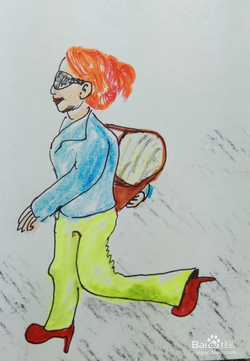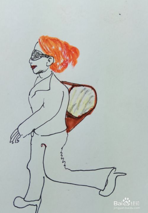 再用线条和曲线画出这个女人背上背着的一个包的外形轮廓,并且涂上色彩。