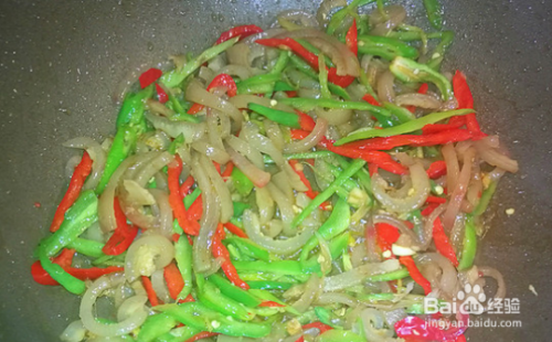 加入青椒,红椒,盐一起翻炒到五成熟 ,和猪皮一起翻炒至熟。