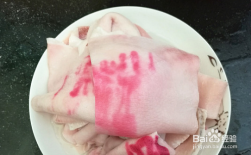 首先将猪皮清洗干净,将表面用刀刮干净。