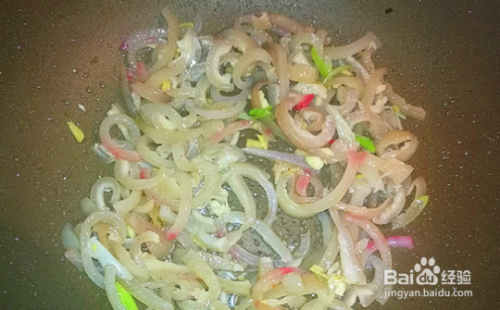 热锅下油,将油烧热,加入生姜,大蒜,大葱爆香,加入猪皮,盐一起翻炒几个来回,将猪皮铲到锅的一边。