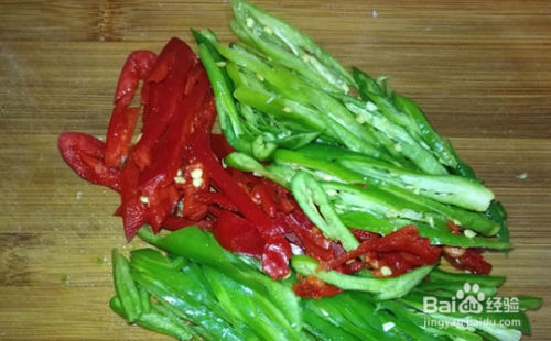 将煮熟猪皮切成小条,这一步的动作有点重复了。这一锅猪皮大部分是用来做皮冻吃的,所以切的比较大块,取了一小部分出来炒青椒,所以又重新切成小块了。大小粗细,大家自行掌控就可以了。