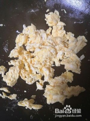 鸡蛋打散。锅烧热放油,油热后开小火。倒鸡蛋炒熟,我喜欢嫩一些。小火炒一会都凝固了就关火了。