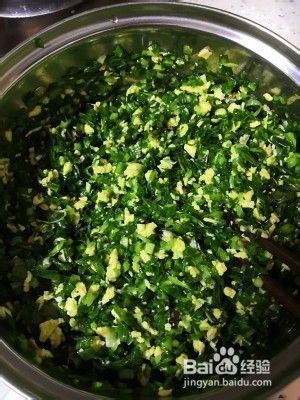 用铲刀把鸡蛋铲成末,也可以用刀切碎。鸡蛋末凉了后跟香菇韭菜放一起。