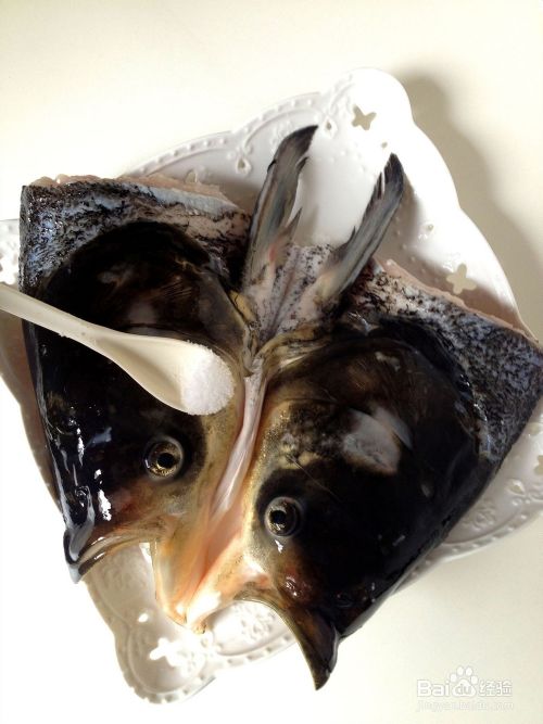 撒少许盐和料酒,均匀涂抹在鱼头的内外表面;