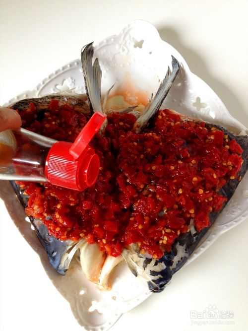 将蒸好的鱼头取出,沥掉盘中多余水分,烧热葱油,趁热浇上;