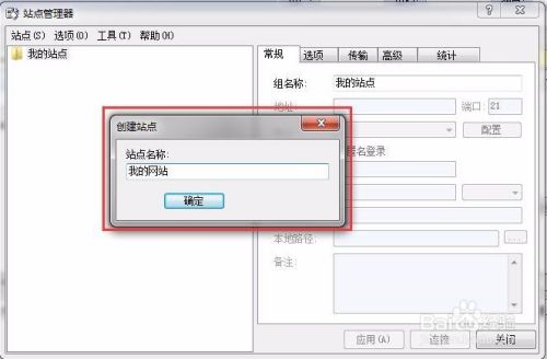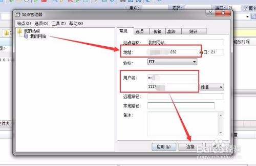然后输入站点名称,这个随便输,可以是你自己网站名称,确定后就可以在站点管理器中看到我们建立的站点名称了,然后在右边输入网站的ip地址和ftp用户名和密码,再点击连接就进入了网站的根目录下了。这个ftp用户名和密码是创建网站时你们自己设置的,可不要忘记了。