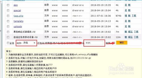 我们将dede前面的方框勾选,然后拉到页面下方选择动作为改名,然后在后面方框中输入新的目录名,然后点击确定就修改成功了。