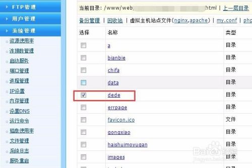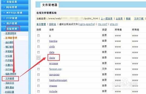 点击左侧系统管理菜单下的文件管理,并从右侧文件夹进入网站的根目录下,就可以看到dede这个管理目录了。