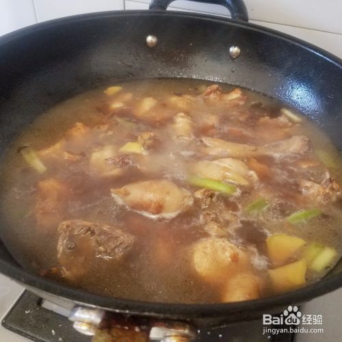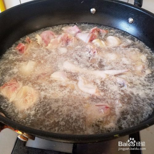 加水和鸡肉齐平,放入盐,花椒,大料,鸡精,大火烧开。