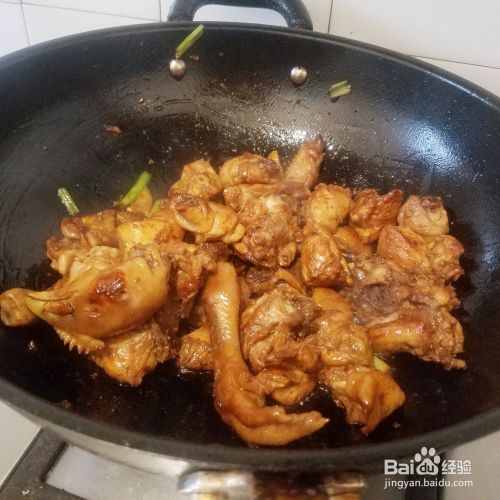 锅中倒入食用油,放入白糖,熬制白糖泛红,放入鸡肉煸炒,放入葱姜爆香,放入生抽煸炒。