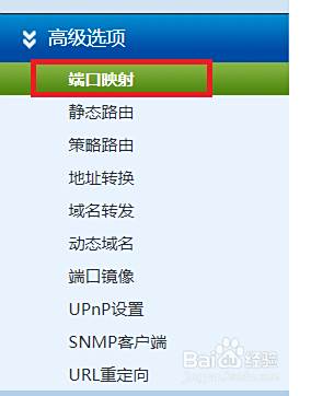 以我使用的一款防火墙为例,登录以后,进入到管理页面,点击高级选项。然后点击里面的端口映射,就可以看到第二张图中所示的内容,会显示外部端口,内部服务器IP,内部端口。