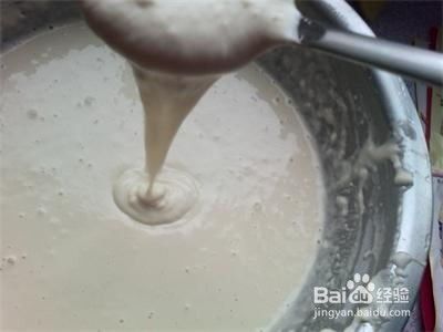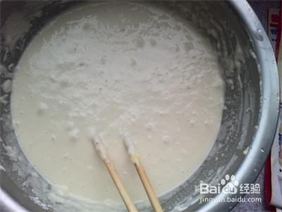 用适量清水调匀,要搅匀不能有疙瘩,水的用量以面糊从勺流下时成一条线就可以了。