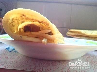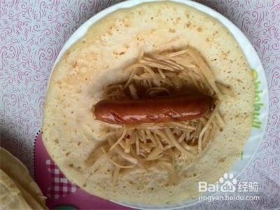 最后取一个面饼,上面加上土豆丝洋葱丝和一个香肠,然后卷起来就可以吃了。来几张成品图吧。