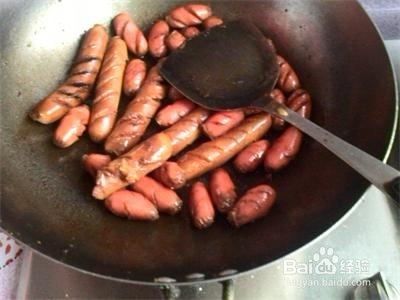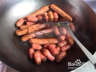 大小两种脆皮肠,用刀划几下,为了使其更好的入味。起锅放油,然后放入肠,中火煎,调味只需放入辣酱和适量蜂蜜就可以了。