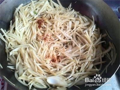 调入适量酱油、十三香、醋,再倒入土豆丝和洋葱丝翻炒。