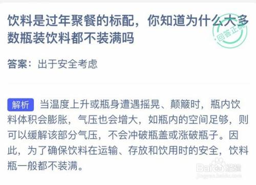 饮料是过年聚餐的标配,你知道为什么大多数瓶装饮料都不装满吗?这是蚂蚁庄园1月16日的问题,下面来一起看看正确答案怎么回答。